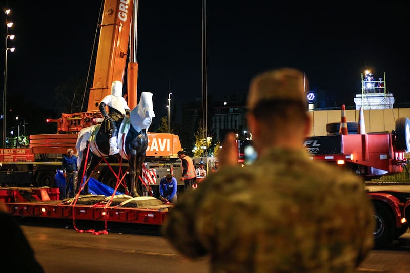 A las 00.30 horas llegó la estatua a la Plaza Baquedano. En el lugar se encontraba el alcalde de Providencia, Jaime Bellolio, quien monitoreaba la instalación de la escultura, que se realizó con una grúa pluma.