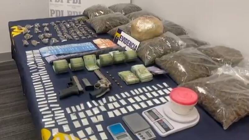 Así, se concretaron cinco órdenes de entrada y registro a domicilios ubicados en las comunas de San Miguel, Quinta Normal, Renca y Maipú, logrando la detención de los sujetos y la incautación de siete teléfonos celulares, dos armas a fogueo, 11 kilos 345 gramos de cannabis y 472,1 gramos de clorhidrato de cocaína, droga avaluada en cerca de $150 millones.