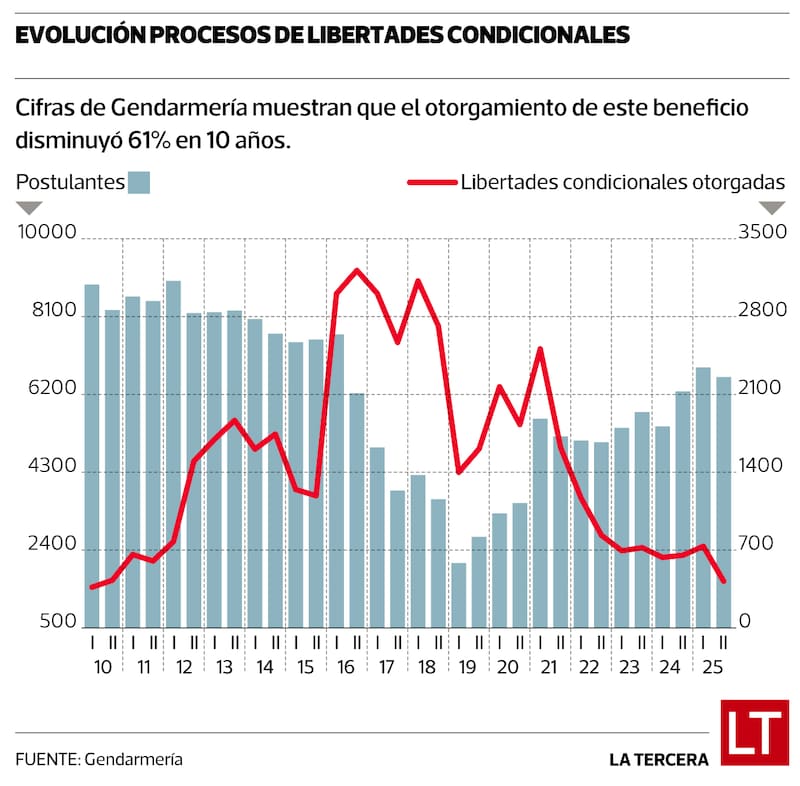 De acuerdo con cifras de Gendarmería a las que La Tercera tuvo acceso, al analizarse los últimos 10 años -tomando como referencia el periodo 2014-2024 debido a que el año 2025 aún no está cerrado-, la libertades condicionales cayeron un 61,5% a nivel nacional.