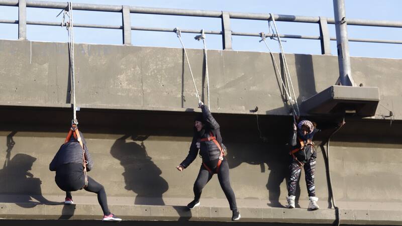 A primera hora de este jueves, tres mujeres se encontraban amarradas y colgadas desde el paso sobre nivel en la rotonda de Américo Vespucio con Avenida Grecia, en la comuna de Peñalolén.
