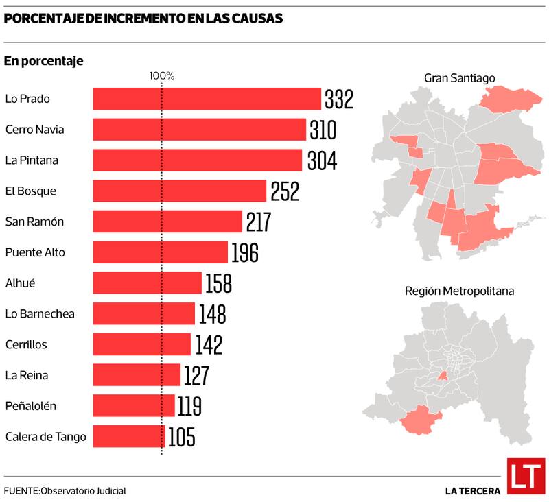 Algo que no ocurre en otras zonas, como es el caso de Lo Prado, comuna en la que número de causas que ingresan aumentará un 332% respecto a lo que el tribunal local revisa todos los años. A esta la siguen comunas como Cerro Navia, con un incremento de 310%, La Pintana (304%), El Bosque (252%), San Ramón (217%), Puente Alto (196%), entre otras (ver infografía).
