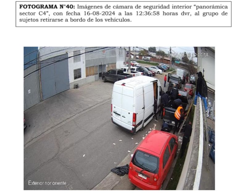 A las 12.29, el furgón blanco y otros dos vehículos comenzaban a movilizarse afuera de Brinks. Como si todo estuviera cronometrado, a las 12.30 en punto, cuatro mujeres salen de la firma para fumar unos cigarrillos. Una de ellas es la cajera Ximena Fuentes, quien fue formalizada y se encuentra en prisión preventiva por su supuesta participación. Fuentes y Saavedra son los trabajadores que los investigadores estiman que entregaron información confidencial de la empresa para concretar el delito.