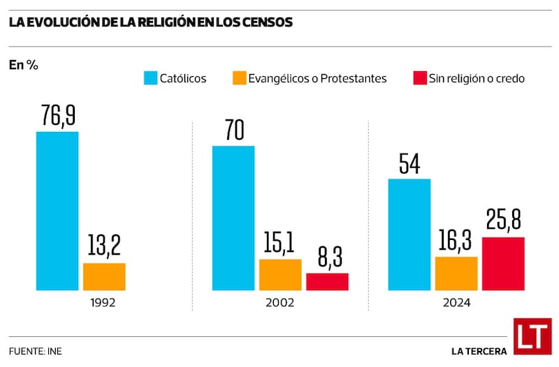 Al respecto, el Censo 2024 pone cifras a esta tendencia: actualmente el 54% de las personas mayores de 15 años en Chile se declara católica. En 2002 ese número llegaba al 70% y en 1992, al 77%.