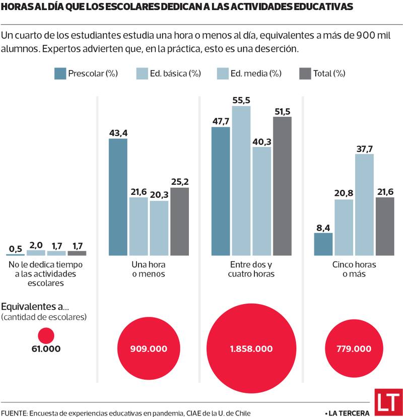 La encuesta muestra que el 1,7% de los escolares no destina nada de tiempo a las actividades educativas, mientras que el 25,2% dedica una hora diaria o menos a su educación. Extrapolado a la realidad nacional, esto quiere decir que cerca de 970 mil estudiantes están en la práctica desconectados de sus colegios (ver infografía).
