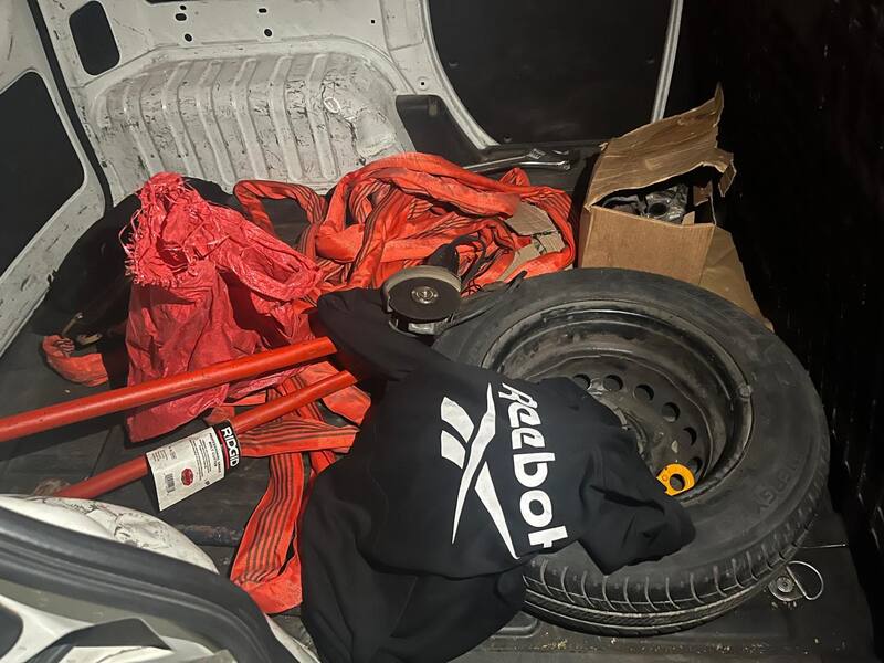 En las cercanías del lugar, encontraron un furgón marca Fiat que mantenía encargo por robo que mantenía adosada una placa patente que no correspondía al vehículo modelo Fiorino. En su interior había un esmeril -además del utilizado en el robo- y discos de corte.