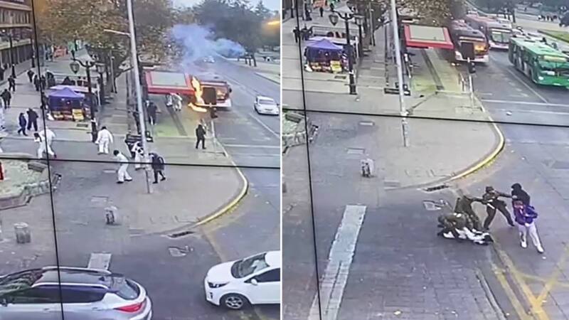 Solo 35 segundos transcurrieron desde que una decena de sujetos vestidos con overoles blancos pararon un bus del transporte público en la intersección de las calles Alameda con Ricardo Cumming, hicieron bajar al chofer y a los pasajeros, rociaron la máquina con líquido acelerante y le prendieron fuego. Todos salieron arrancando. Justo en ese momento funcionarios de Carabineros que realizaban un patrullaje preventivo por el lugar se percataron de lo que estaba ocurriendo y comenzaron a correr, logrando uno de los efectivos reducir a un sujeto que escapaba vestido de blanco. El uniformado lo detuvo, a eso de las 9:35 horas, y se procedió a trasladarlo a dependencias de la 48° Comisaría. De inmediato se dio aviso a la Fiscalía. Todo quedó registrado en cámaras de seguridad.