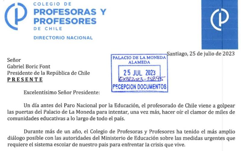 “Las profesoras y profesores de Chile no olvidan que buena parte de estos planteamientos fueron asumidos directamente por su persona cuando era candidato presidencial y esperan que en el alto cargo que ostenta honre su palabra y avance decididamente con la justicia que merecen profesores y profesoras...”, agregaba la carta, en la que, además, piden una reunión directa con el Mandatario.