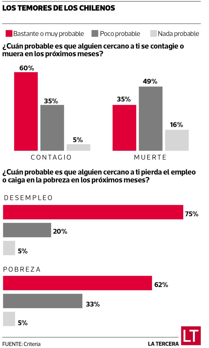 A la vez, la mayoría de la población piensa que es muy probable que la pandemia aumente el desempleo y la pobreza en su círculo cercano y casi todos creen que lo peor de la crisis está por venir. “Tenemos un entramado de miedos, a los contagios, a las muertes, a la pobreza y el desempleo, y son temores muy transversales”, analiza Valdivieso, pues la crisis impacta a las familias de clase media, que temen volver a la pobreza de la que salieron en los años 80 y 90. “Pagar la carrera universitaria, la casa y el auto también se ven como posibilidades que se pueden truncar”, añade.