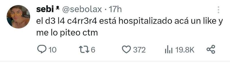 En el escueto mensaje se daba a entender que el parlamentario estaba internado en un centro hospitalario. “El d3 l4 c4rr3r4 está hospitalizado acá un like y me lo piteo ctm (sic)”, decía el escueto mensaje. Luego, otros usuarios de la red social, identificaron al tuitero como Sebastián de la Rosa Landauro, un nutricionista que trabajaba en la Clínica Santa María.