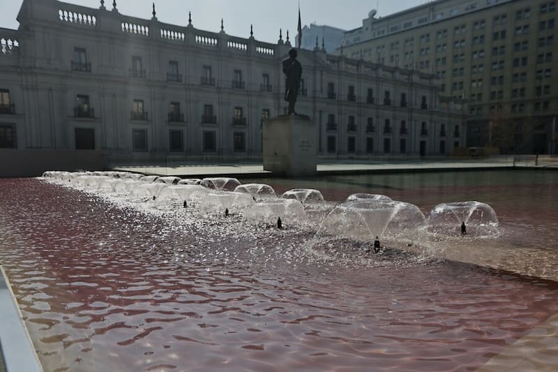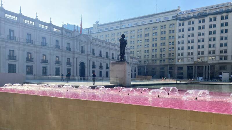 Una pileta teñida de rojo frente a La Moneda: se registra manifestación en paralelo a acto de cierre de Convención