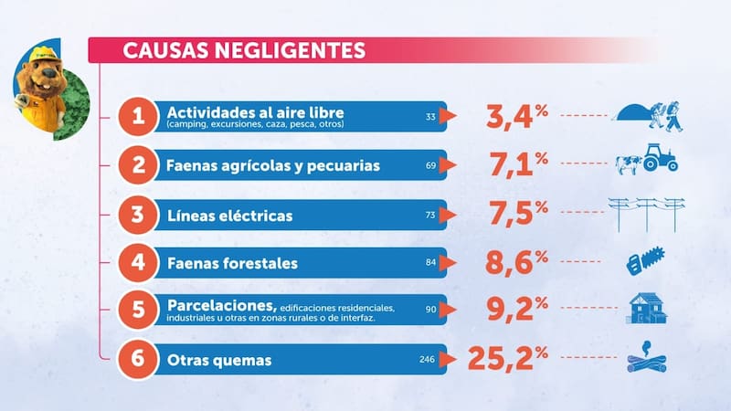 El director ejecutivo de Conaf, Rodrigo Illesca, especificó que la mayoría de los incendios son producidos por el uso de herramientas que generan chispas. Esto se suma a las causantes por faenas agrícolas y pecuarias, faenas forestales, parcelaciones, actividades al aire libre, entre otros.