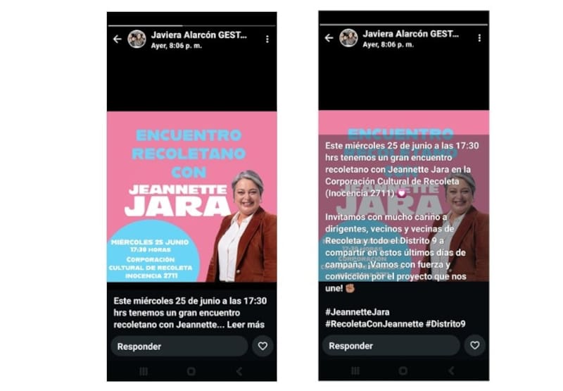 Luego, indican, el día 24 de junio, Javiera Alarcón Vega, quien se desempeña como gestora territorial de la Municipalidad, realizó otra invitación a dirigentes sociales y vecinos de la comuna, para que asistieran a una actividad denominada “Encuentro Recoletano con Jeanette Jara”.