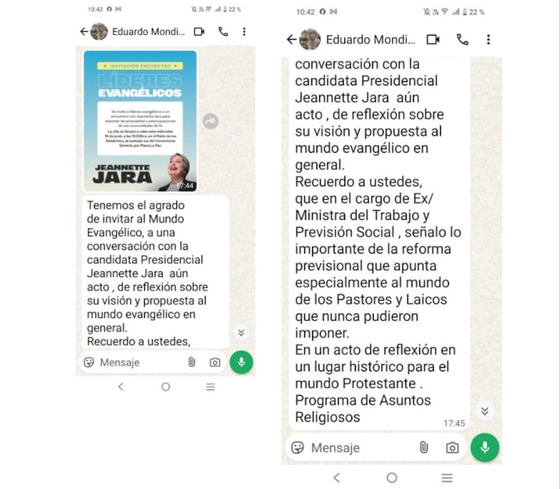 En el caso en cuestión, sostienen, todo eso se habría transgredido, toda vez que con fecha 16 de junio Eduardo Mondino, encargado de Asuntos Religiosos de la I. Municipalidad de Recoleta, envió a través de la aplicación WhatsApp una invitación dirigida a líderes evangélicos, convocándolos a participar en una actividad denominada “Encuentro de Líderes Evangélicos” con la candidata Jeanette Jara.