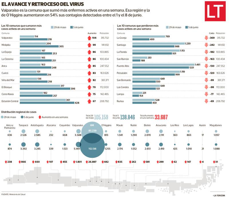 Además, los reportes ministeriales indican que entre el 1 y el 8 de junio, la Región de Valparaíso contabilizó 1.801 contagios nuevos detectados por los laboratorios, y es la segunda con más casos, después de la Metropolitana (ver infografía).