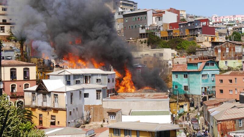 A eso del mediodía -en pleno desarrollo del siniestro-, el delegado presidencial de la región, Jorge Martínez, advertía que “la situación es crítica”. Dijo que las viviendas eran de material ligero y están “pegadas unas a otras en una escala y eso hace muy difícil el trabajo bomberil”.