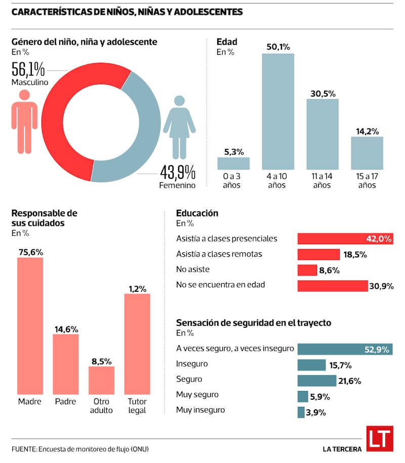 Una de las principales características advertidas por las encuestas es la alta presencia de menores de edad en los flujos migratorios. De hecho, el 40% de los adultos que ingresan al país lo hacen en compañía de un niño, niña o adolescente.