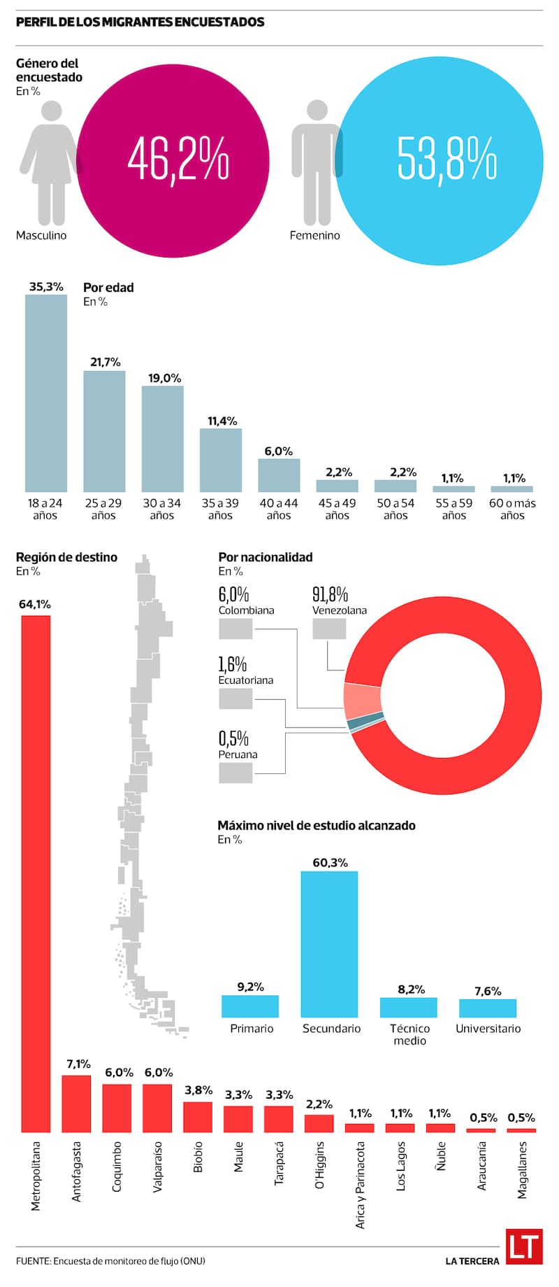 La encuesta, realizada por ONU Migraciones (OIM) y por la Agencia de la ONU para los Refugiados (UNHCR ACNUR), entrevistó a 184 personas entre el 16 y 30 de junio, quienes entregaron características personales, información respecto a su trayecto, condiciones de seguridad en las que viajaron y sus expectativas al llegar a Chile, entre una serie de datos. Junto con eso, la medición sumó a 82 niños, niñas y adolescentes, totalizando así una consulta con 266 personas.