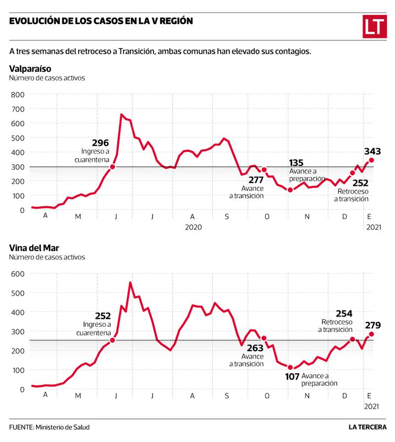 Así, mientras Valparaíso registraba 296 contagios activos cuando inició el confinamiento en la primera ola, actualmente estos se elevan a 343, según las estadísticas del Minsal. En tanto, si Viña del Mar contaba con 252 casos activos para esa fecha, hoy el número ha sido superado y alcanza los 279 pacientes en condición de transmitir el virus.