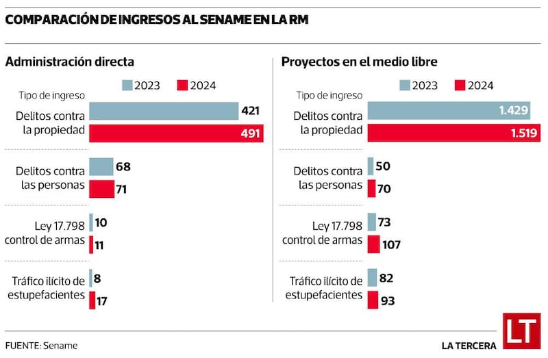El organismo identificó también un alza en los ingresos a Centros de Administración Directa por cuatro tipos de delitos entre 2023 y 2024. Por la Ley de Control de Armas, un 10%; por delitos contra la propiedad, un 16,6%; por delitos contra las personas (robos, agresiones, etc.), un 4,4%, y por tráfico de estupefacientes, un 112,5%.