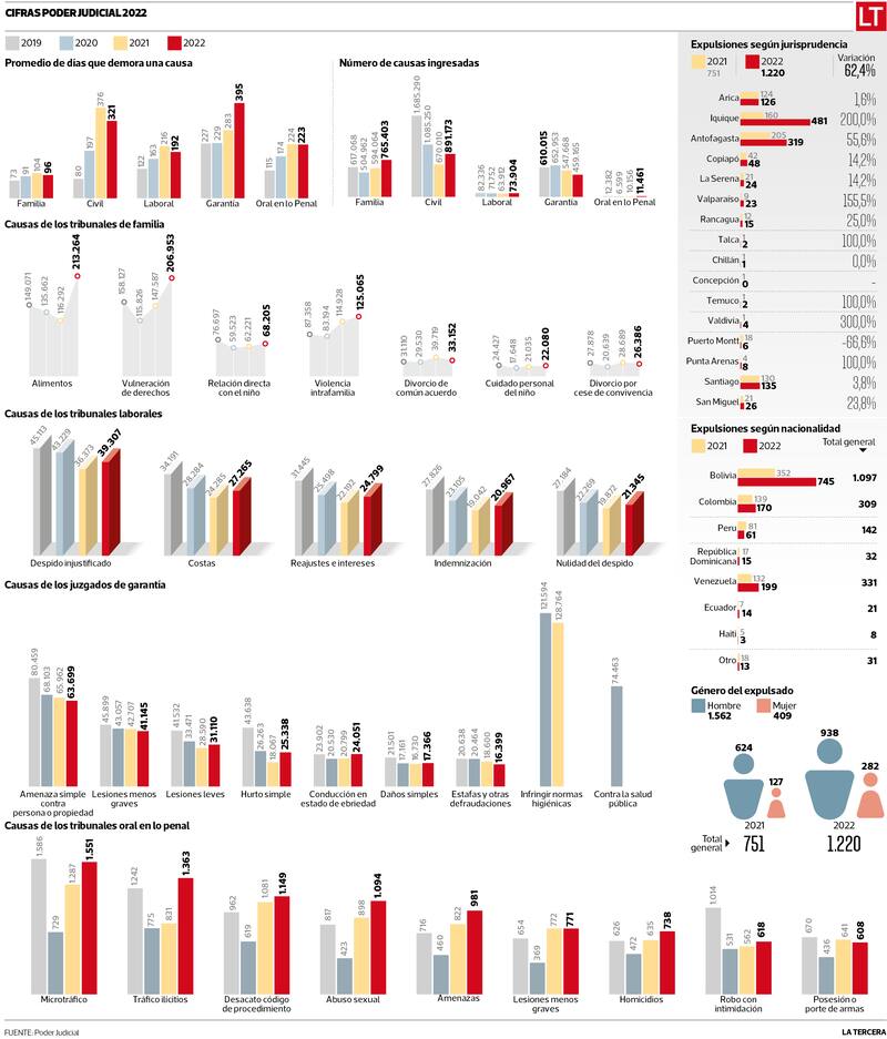 Las cortes de Apelaciones también tuvieron cambios en sus estadísticas durante el año pasado. Los tribunales de alzada dictaron 1.220 expulsiones judiciales durante 2022, un 62,4% más que en 2021. Este tipo de acciones se dicta contra personas que han cometido delitos y tienen condenas de menos de cinco años y un día, a quienes se les conmuta la pena con la condición de ser expulsados del país.