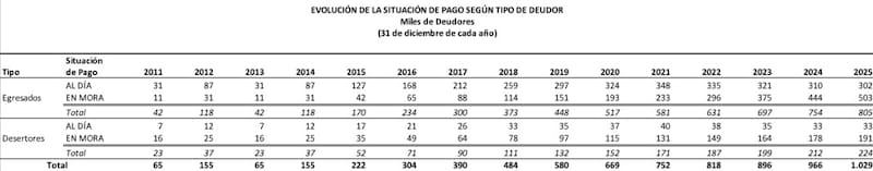 Como dato, las personas al día o con cuentas saldadas, tanto desertores como egresados, pasaron de representar el 62,1% de los casi 304 mil beneficiarios del CAE que había en diciembre de 2016, al 32,5% del 1.029.000 de diciembre de 2025.