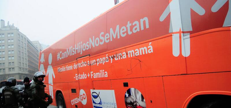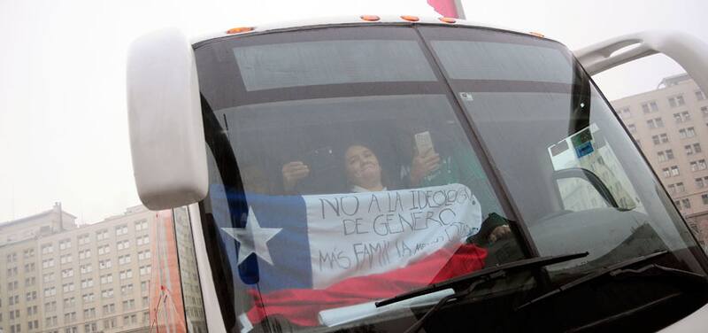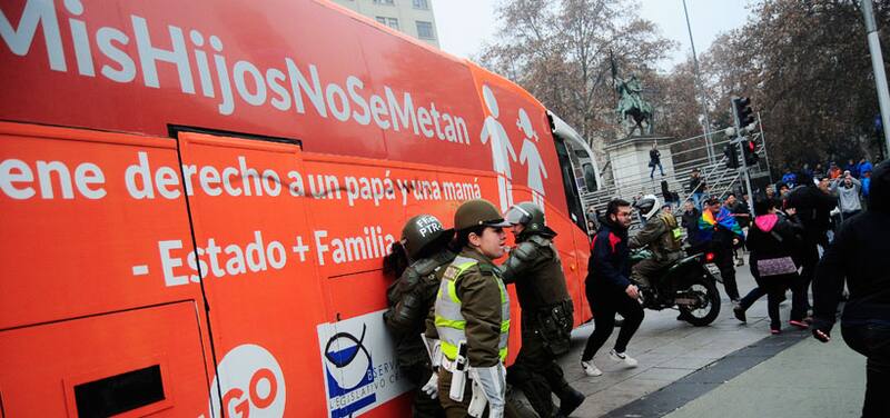 Desde muy temprano en la mañana personas defensoras del Bus de la Libertad esperaban con pancartas frente a La Moneda la llegada de la maquina naranja de la ONG española Hazte Oír. Mientras, desde la otra esquina de la Alameda, movimientos en defensa de las minorías sexuales preparaban el Bus de la Diversidad.