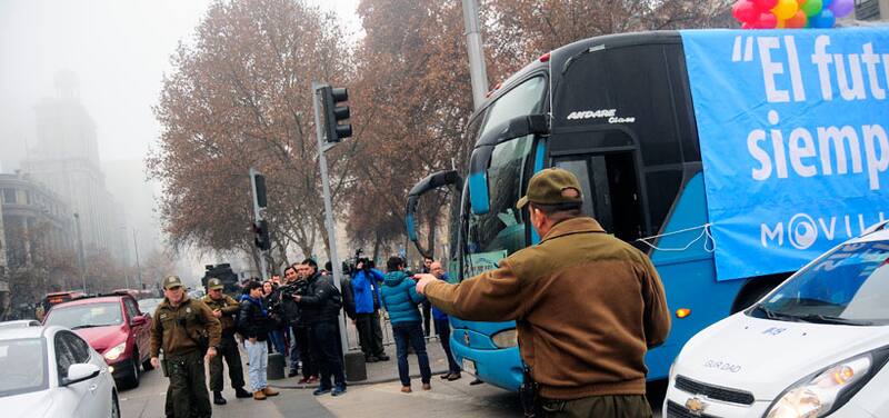 Defensores y retractores del bus de la ONG española se manifestaron con pancartas frente al Palacio de la Moneda, generando discusiones acaloradas entre los presentes.