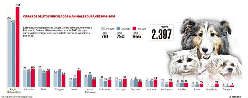 En 2016, la Bidema investigó 866 delitos por maltrato animal en todo Chile, de los cuales el 40% corresponde a la Región Metropolitana, seguida por Valparaíso (9%). Además, en 2016 se registró un 15% de aumento respecto del año anterior, cuando el total de investigaciones a nivel país llegó a 750.