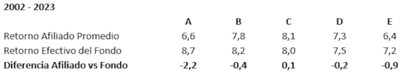 En la imagen 1 se puede apreciar las rentabilidades efectivas anotadas por los distintos fondos -y que recibe el cotizante que se mantiene en ellos- y el retorno del afiliado promedio que se cambia de fondos. Como se ve, las mayores diferencias -por lo tanto, el mayor daño patrimonial- se registran en los fondos A (2,2% anual de daño patrimonial) y E (0,9% anual de daño patrimonial), que son los dos más expuestos a los cambios. El fondo C es el único que no exhibe un detrimento para los cotizantes.