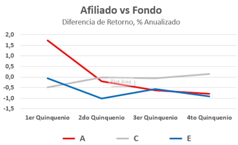 En los fondos A y E, los primeros cinco años prácticamente no hubo movimientos de afiliados y no se registra daño patrimonial. Por el contrario, el cuarto quinquenio fue el que tuvo más actividad, debido al aumento de las recomendaciones de cambio de fondos por parte de asesores y los retiros del 10% de fondos previsionales aprobados por el Congreso. Eso hizo que este último período exhiba el mayor daño patrimonial para el afiliado. En el Fondo C, por el contrario, que es donde existe la menor proporción de cambios de fondo, el afiliado promedio no ha sufrido daño patrimonial.