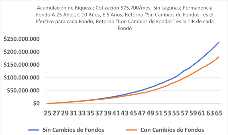 El estudio simuló el ciclo de vida laboral de una persona (en este caso un hombre), el que usualmente se extiende por 40 años: asume que está invertido en el Fondo A los primeros 25 años, en el Fondo C los siguientes 10 años y en el E los últimos 5 años. Bajo ese supuesto se simuló la acumulación de riqueza de un afiliado que nunca se cambia de fondo -y que, por lo tanto, recibe el “retorno efectivo del fondo” en que estuvo invertido para cada tramo etario- versus el cotizante que se mueve entre fondos y que obtiene el retorno del “afiliado promedio” para cada tramo etario.