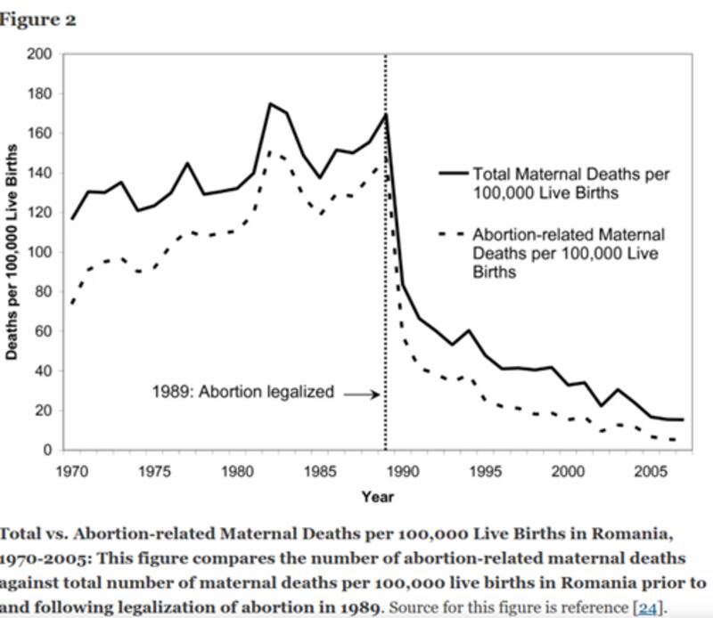 Por ejemplo, un estudio de Janie Benson y coautores que revisa diversos otros estudios sugiere que existe una fuerte evidencia a favor de la relación entre la despenalización del aborto y caídas en las tasas de mortalidad materna. Estos hechos no son cuestionables o realizados en base a evidencia estadística débil. Basta mirar las cifras crudas para apreciar la realidad. El caso de Romania, presentado por Benson y coautores (en la figura a continuación) es emblemático: la aprobación de aborto legal resultó en una caída notable en la tasa de mujeres que fallecen durante el embarazo, y esto se debía especificamente a muertes relacionadas al aborto.