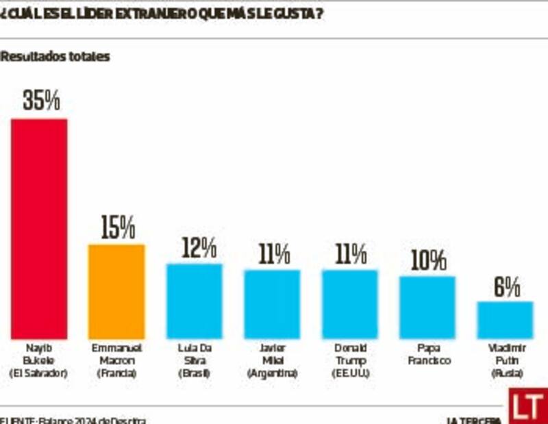 Quizás por esa razón, uno de cada tres chilenos (35%) lo elige como el líder extranjero que más le gusta según el Balance 2024 de Descifra. Un 42%, según Cadem, desearía que el próximo Presidente de Chile tenga un estilo similar a Bukele, quien en la misma encuesta tiene una imagen positiva de un 81%. No hay ningún otro líder internacional que tenga tanta adhesión entre los chilenos como Bukele, y no hay recuerdo, en la historia reciente, de alguien que haya alcanzado tal nivel de consenso.