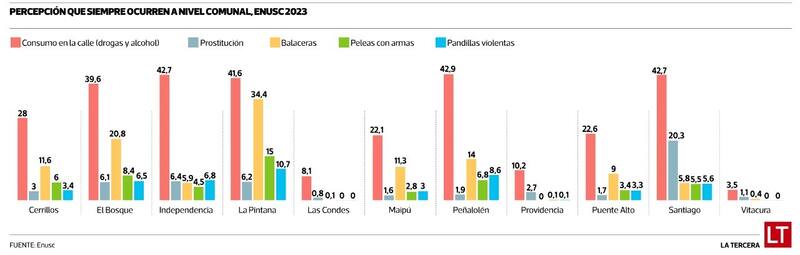 Los primeros datos analizados (ver infografía) muestran al menos tres hechos claves: primero, los problemas que se enfrentan en el espacio público son diversos y, por ende, políticas públicas hipercentralizadas no sirven. Es hora de permitir que los alcaldes y alcaldesas tengan más músculo y financiamiento para el diseño e implementación de iniciativas destinadas a sus problemas, principalmente en la prevención, pero también en la coordinación de las acciones de control. Así, por ejemplo, en El Bosque y La Pintana las constantes balaceras reconocen la necesidad de presencia policial y mayor control en lugares específicos, mientras que en Maipú y Puente Alto el consumo de alcohol y drogas en las calles requiere de programas de fiscalización, limitación de patentes, presencia policial, uso de espacios públicos y programas destinados a consumidores problemáticos. Esto no quiere decir abandonar los otros problemas, pero priorizar es urgente.