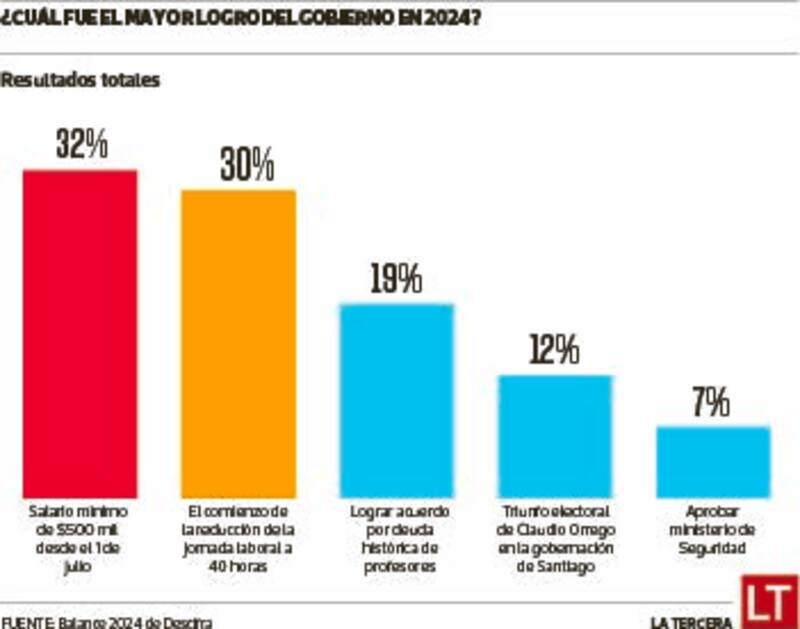 En el Balance 2024 de Descifra, el resultado sobre los logros del gobierno durante 2024 arroja señales muy específicas. Para la mayoría, sobre todo entre quienes perciben menos ingresos, lo más importante fue el alza del salario mínimo, en primer lugar (32 por ciento); luego, la reducción de la jornada laboral (30 por ciento) y, en tercer lugar, el acuerdo para el pago de la deuda histórica a los profesores (19 por ciento). Más atrás quedan asuntos coyunturales como la reelección de Claudio Orrego en la Gobernación de Santiago. Entre todos los nombrados el único logro que tendrá un alcance perdurable en el futuro es la reducción de la jornada laboral: el alza del salario mínimo, aunque establece un nuevo punto de arranque para las discusiones que vengan, no asegura un beneficio a largo plazo si juegan en contra la inflación y el desempleo; por último, la generación de docentes que por fin recibirá una reparación tras el despojo en dictadura son personas ya muy mayores, a quienes esta noticia, a estas alturas, por el monto comprometido, les llega más como un símbolo de reconocimiento que como una retribución justa.