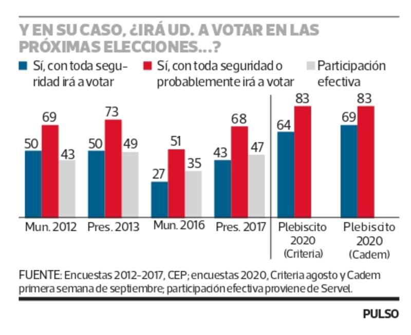 El gráfico muestra la relación histórica entre la intención de voto según la última encuesta CEP antes de la elección y la participación efectiva para las elecciones, desde que tenemos voto voluntario. Los que dicen que irán a votar con seguridad se han acercado a la participación real con un margen de +/-8 puntos. En tanto, la razón entre los que dicen que votarán segura o probablemente y los que, de hecho, votan, ha oscilado entre 0,62 y 0,69. Los dos últimos grupos de columnas muestran la intención de voto para el plebiscito próximo según las últimas encuestas de Criteria y Cadem (que no son presenciales como la CEP).