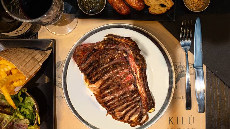 Pero más allá de todos estos recuerdos santiaguinos noventeros, lo que ahora me convoca es que en este mismo lugar abrió sus puertas en algún momento del año pasado el restaurante Kilú, que se denomina como una “Casa de Carnes” y que presenta una oferta, obviamente centrada en las carnes a la parrilla, bien particular. Me explico. En su carta se ofrecen tres cortes de carne: Costeleta de Lomo Vetado, Costeleta de Lomo Liso y Entrecot; los que pesan alrededor de un kilo y tiene un precio único de $42.900, lo que incluye además una porción pequeña de papas fritas y otra de ensalada verde.