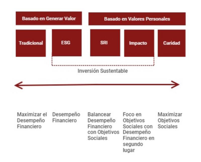 Es así como en un lado (izquierdo) tenemos las categorías basadas en generar valor, que incluyen los enfoques de inversión diseñados para obtener una relación eficiente entre retorno y riesgo; y, en el otro extremo, están las categorías basadas en valores y preferencias personales, que incluyen estrategias que consideran el desempeño financiero después de que se hayan satisfecho los valores en los que creen los inversionistas.