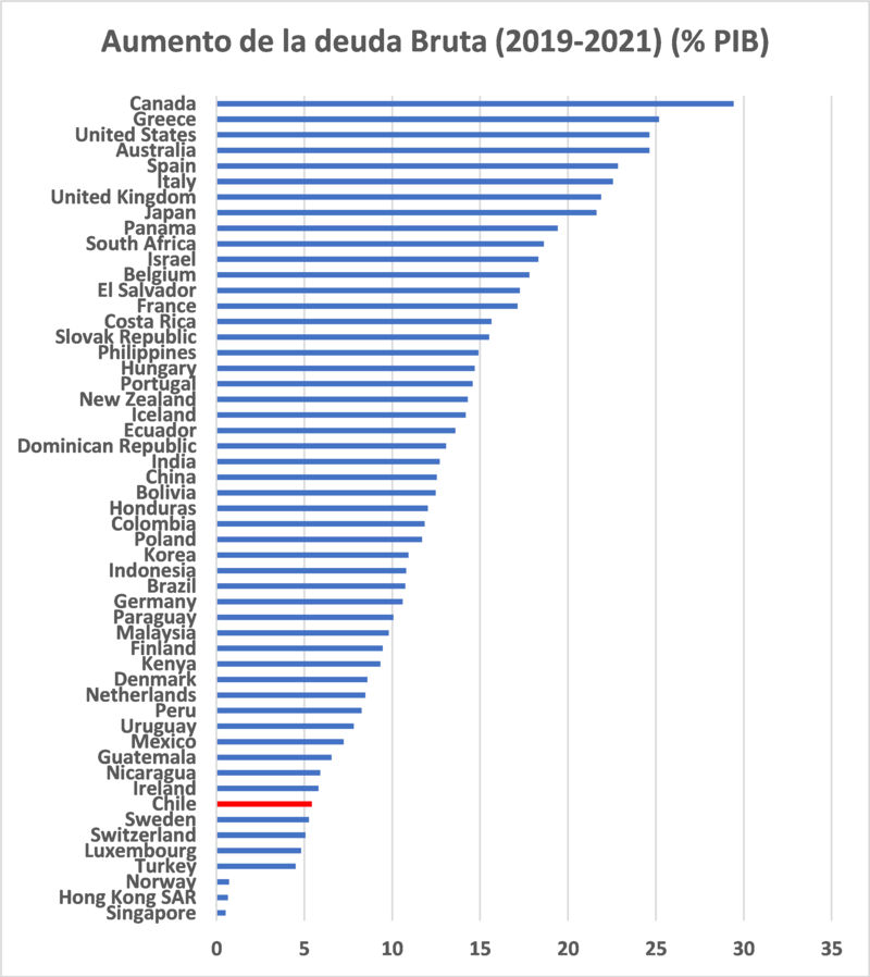 Sin embargo, Chile se encuentra en una situación fiscal privilegiada. En el marco de la pandemia, muchos países han tenido que recurrir a una fuerte alza de la deuda pública. Por ejemplo, Canadá entre el 2019 y el 2021 aumento 29 puntos del PIB su deuda pública, Australia y EEUU 25 puntos adicionales, España 23 puntos adicionales, Nueva Zelanda, Portugal 14 puntos adicionales. Por el contrario, Chile en el mismo período solo aumento su deuda en 5 puntos, una de las menores alzas de la deuda pública de un conjunto amplio de países desarrollados y en desarrollo. De todas maneras, proyectamos aumentos de la deuda publica en alrededor de 10 puntos del PIB en los 2 primeros años de gobierno, lo que implica una tasa de incremento muy inferior a la de los países nombrados.