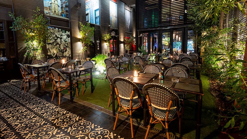 Nos ubicamos en una mesa justo frente a la parte abierta de su cocina, donde hay una pequeña parrilla y se despachan los platos. Además, teníamos vista a un agradable patio interior donde -alabado sea el Señor- todavía está permitido fumar.
