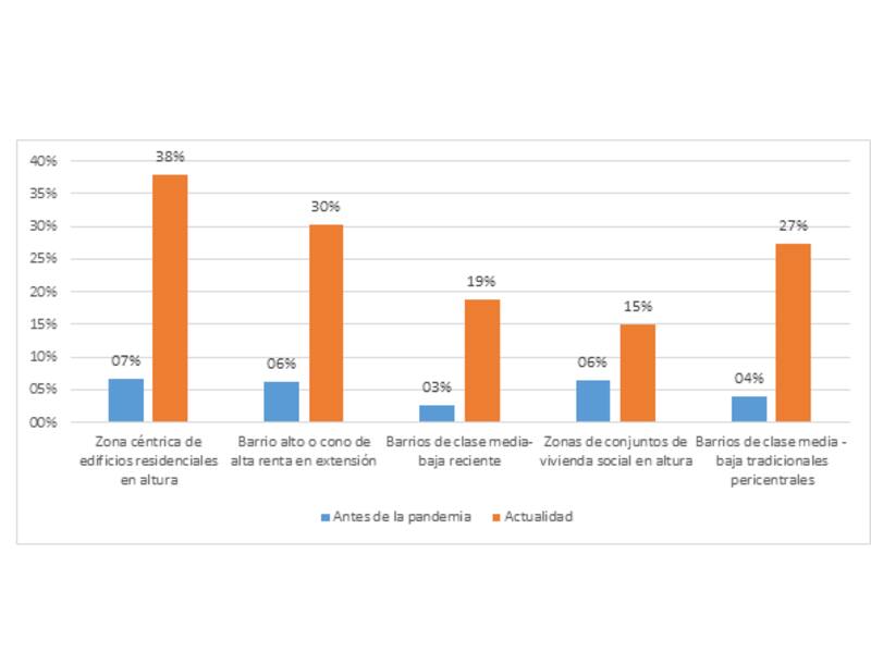 Finalmente, respecto a la percepción de los vecinos, aspecto analizado a partir de cuán conflictivos son los vecinos del barrio, los resultados muestran un aumento de esta dimensión en el período analizado, siendo generalizada el aumento de la percepción negativa de los vecinos, destacando en esta lógica aquellos barrios de vivienda social. En particular, antes de la pandemia el 23% de los habitantes de estas zonas consideraba que sus vecinos eran conflictivos; mientras que, en la actualidad, un 35,1% considera que son conflictivos.