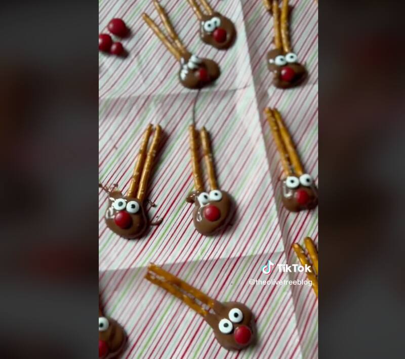 Esta puede ser una excelente idea para hacer con niños. Para hacer estos lindos renos, propuestos por los tiktokers The Olive Tree, necesitas palitos salados, chips de chocolate, chocolates rojos y ojos de caramelo. Comienza derritiendo los chips de chocolate con un poco de aceite de oliva —con un minuto en el microondas es suficiente— y revuelve. En una bandeja con papel antiadherente, pon juntos dos de los palitos y agrégales chocolate derretido. Decora con un chocolate rojo como nariz junto con los ojos antiadherentes. Refrigera por al menos dos horas. Revisa el tutorial completo >aquí<