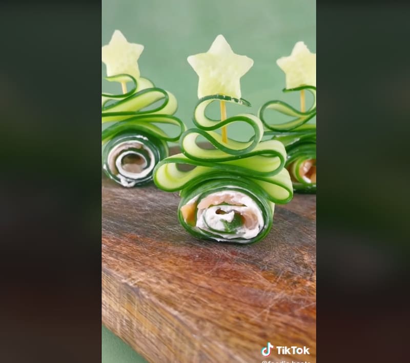 Si estás buscando un bocado fresco y sabroso, estos arbolitos de Navidad que propone Food Beats pueden ser lo que estabas buscando. Para hacerlos solo necesitas un pelador de verduras y rebanar una lonja de pepino. Sobre ella puedes untarle queso crema, palta y salmón ahumado en trocitos (o también pueden ser pepinillos y tomates cherry).