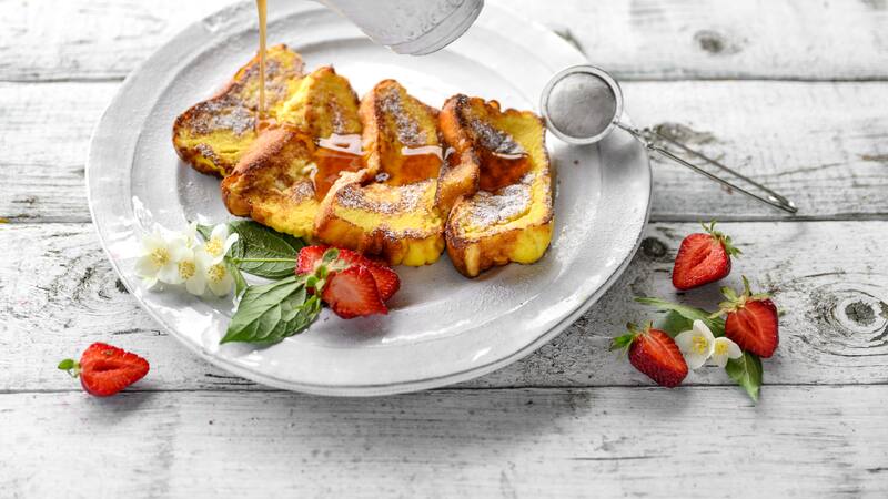 En un plato coloque las tostadas, el tocino y sobre las tostadas, los frutos rojos. Termine con miel de maple o de palma, según sea su preferencia. Espolvoree azúcar flor a manera de decoración.