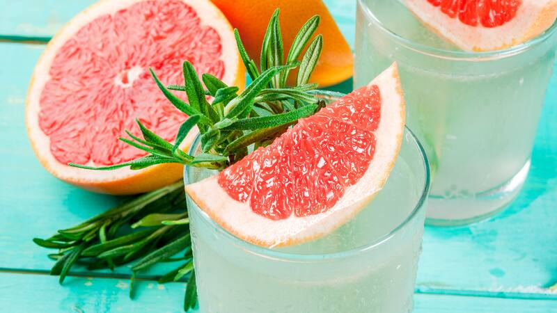 Poner la mezcla en el vaso y decorar con ramitas de romero y rodajas de pomelo.