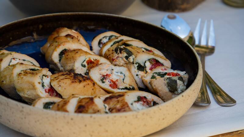 1. Prepara el relleno del pollo, corta el cebollín en rodajas finas. Hidrata el tomate deshidratado en agua hirviendo por 10 a 15 minutos, luego corta en juliana. Calienta un sartén con un poco de aceite de oliva. frie el cebollín y agrega sal y pimienta, deja cocer hasta que se vea dorado, si se seca mucho puedes agregar agua o vino blanco, luego agrega el tomate deshidratado, mezcla bien y luego la espinaca cortada en juliana. Apaga el fuego y agrega el queso crema, una vez que esté bien mezclado, deja enfriar.