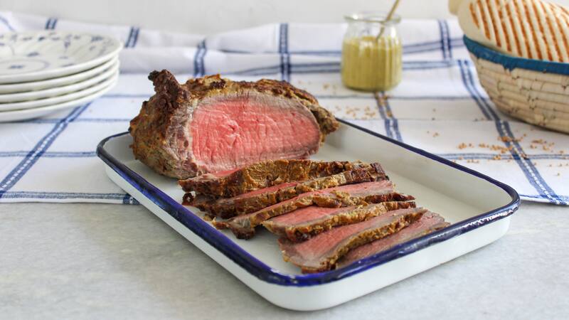 Con la ayuda de las manos, bañar el trozo de carne con la mostaza. Luego, salpimentarlo por todos sus lados y después ponerlo en una fuente para horno previamente aceitada. Agregar un poco más de aceite de oliva por encima y llevar al horno muy fuerte —250º— por veinticinco a treinta minutos. Sacar del horno y dejar reposar. A los diez minutos ya se puede cortar y servir en lonjas bien delgadas. Pero si lo quieren frío, denle unas cuatro horas de descanso antes de cortarlo. Servir con ensaladas varias y un poco más de mostaza para untar la carne.