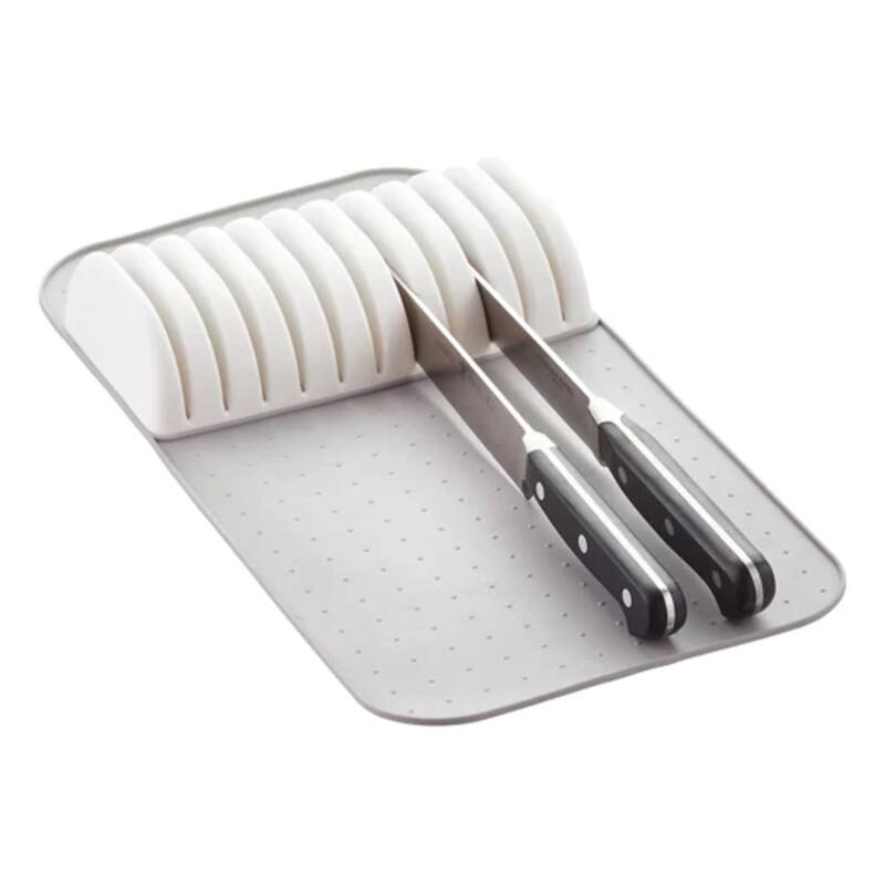 Y si ninguna de esas dos opciones es posible, existen otras dos, aunque un poco menos prácticas. La primera es comprar fundas plásticas para los cuchillos, y así poder guardarlos tranquilamente en un cajón. Eso hace que no estén tan a la mano, pero al menos entregan seguridad —tanto para uno como para el cuchillo. Y la segunda entre las segundas es conseguir un soporte para almacenar cuchillos en el cajón: una estructura que permite que las herramientas se mantengan quietas, fijas y ordenadas.