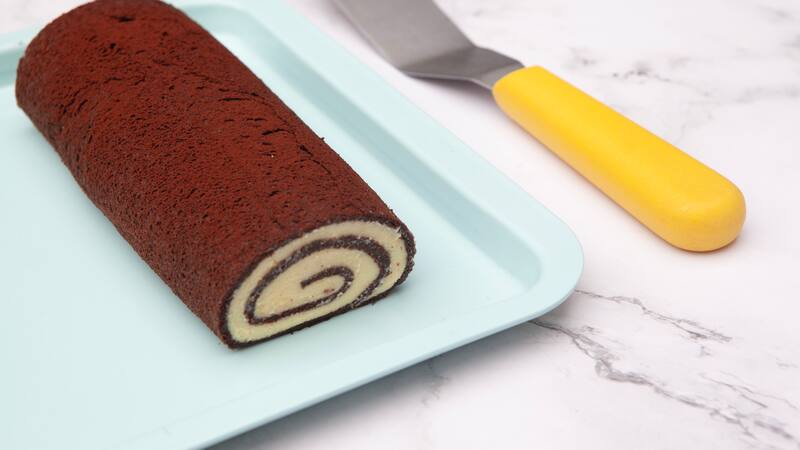 - Para el montaje, rellenar el bizcocho con la crema de limón y enrollar. Cortar los bordes para mejorar la presentación. Por último, espolvorear con azúcar flor o cacao en polvo a gusto.