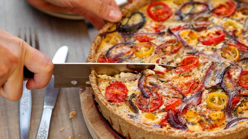 Esta receta de Fernanda Giacaman es a base de zapallo italiano, tomate cherry y queso gruyere, pero también podría ser con zanahorias, berenjenas, champiñones o queso de cabra. Lo más importante es asegurarse de que los ingredientes que uses, especialmente los vegetales, hayan perdido todo su líquido antes de formar parte del quiche, de lo contrario, cuando entren al horno, ablandarán la masa y todo tu esfuerzo se irá a la merde.